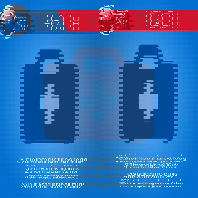 * Health: $3.2 billion injection over four years, including $2.2 billion more for DHBs and $126m for elective surgeries and other areas. $750m for hospital upgrades and rebuilds.