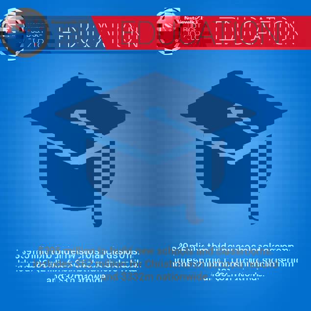 * Education: $395 million to build new schools and classrooms. Includes $62 million for Christchurch schools rebuild and $332m nationwide.
