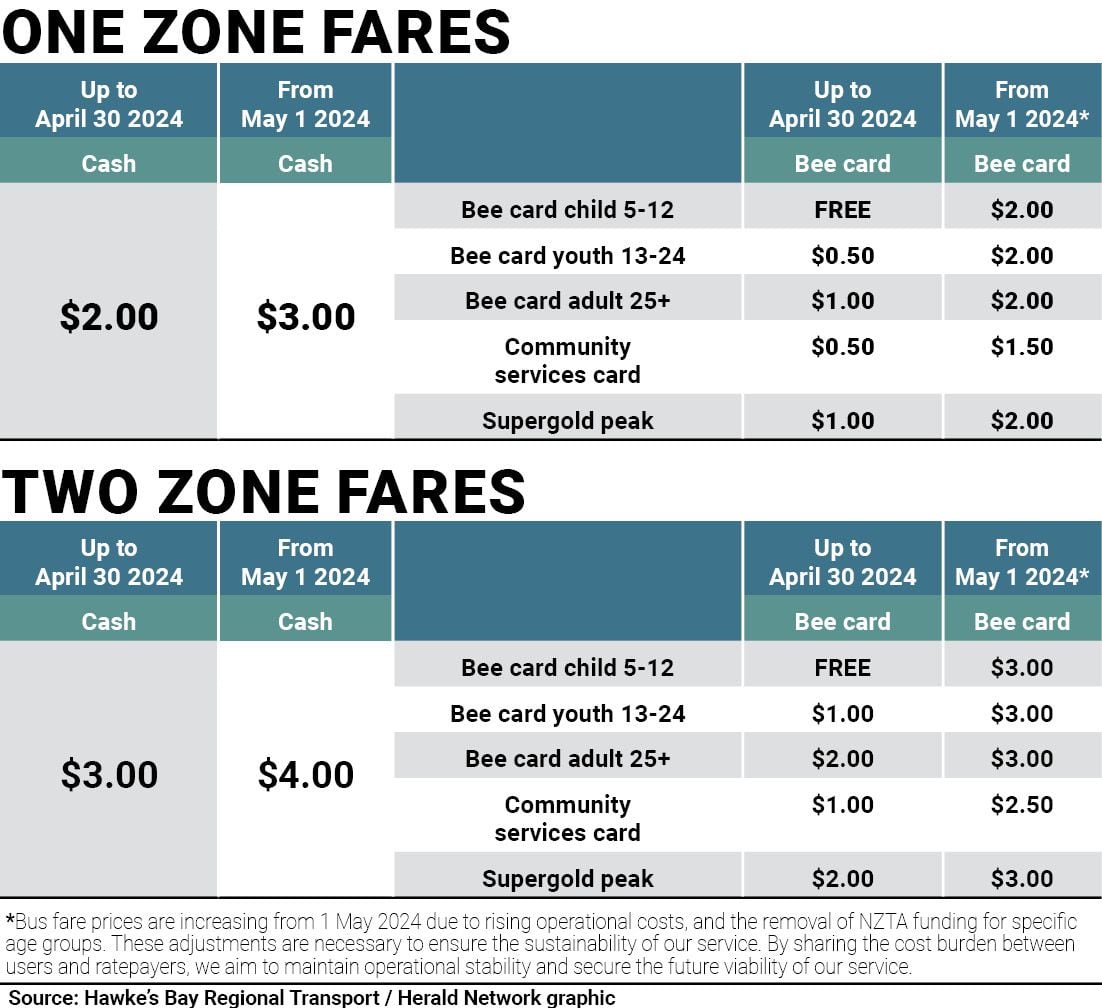 For two-zone trips, between Napier and Hastings, Bee Card fares rise to $3, except for Community Service Card holders which go from $1 to $2.50.听听